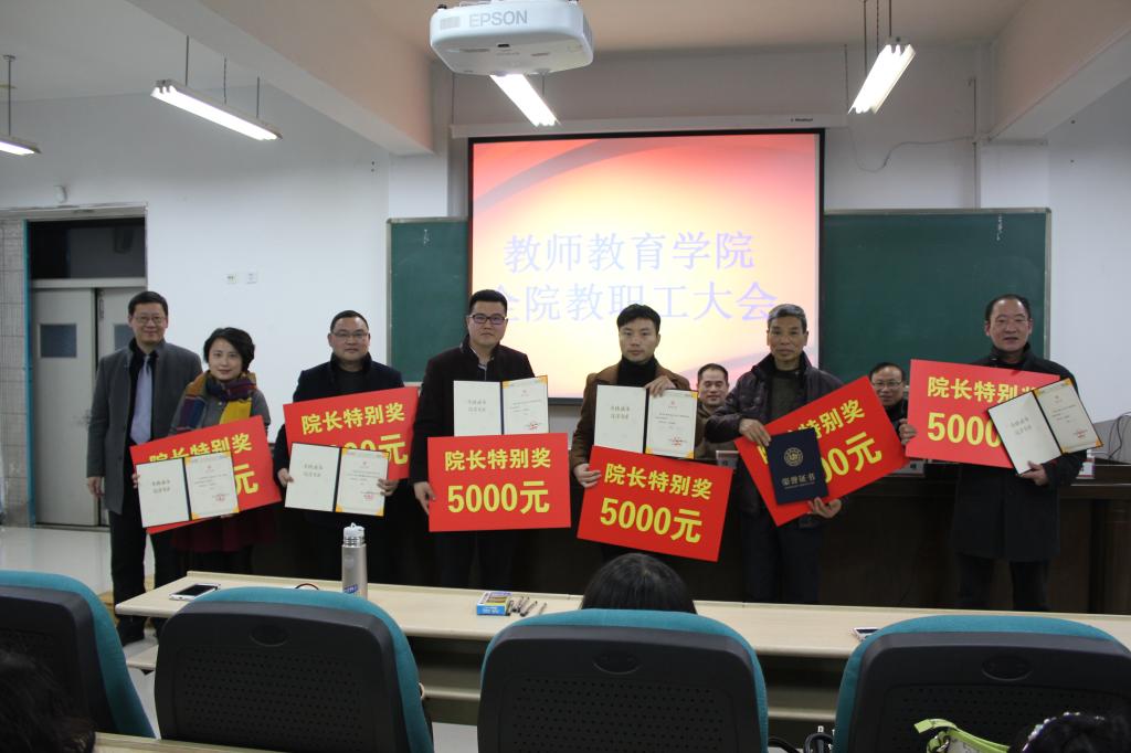 会议表彰了2015年院长特别奖获得者、2015年就业工作先进个人(集体)和2015年院工会活动积极分子。胡瑜、颜文靖、罗顺文、陈正枫等4位老师以及行政管理团队、小教专业学生竞赛指导团队等2个团队荣获了2015年院长特别奖。折延东、盛建森、李伟、张龙、徐平、陈铿、朱春桃、章伟丹等八位老师及学生科获得了就业奖励。朱伟、金荣乾、折延东、谭莉、严晓秋、胡铸鑫、邵胜男等7位老师获得了工会活动积极分子的奖励。