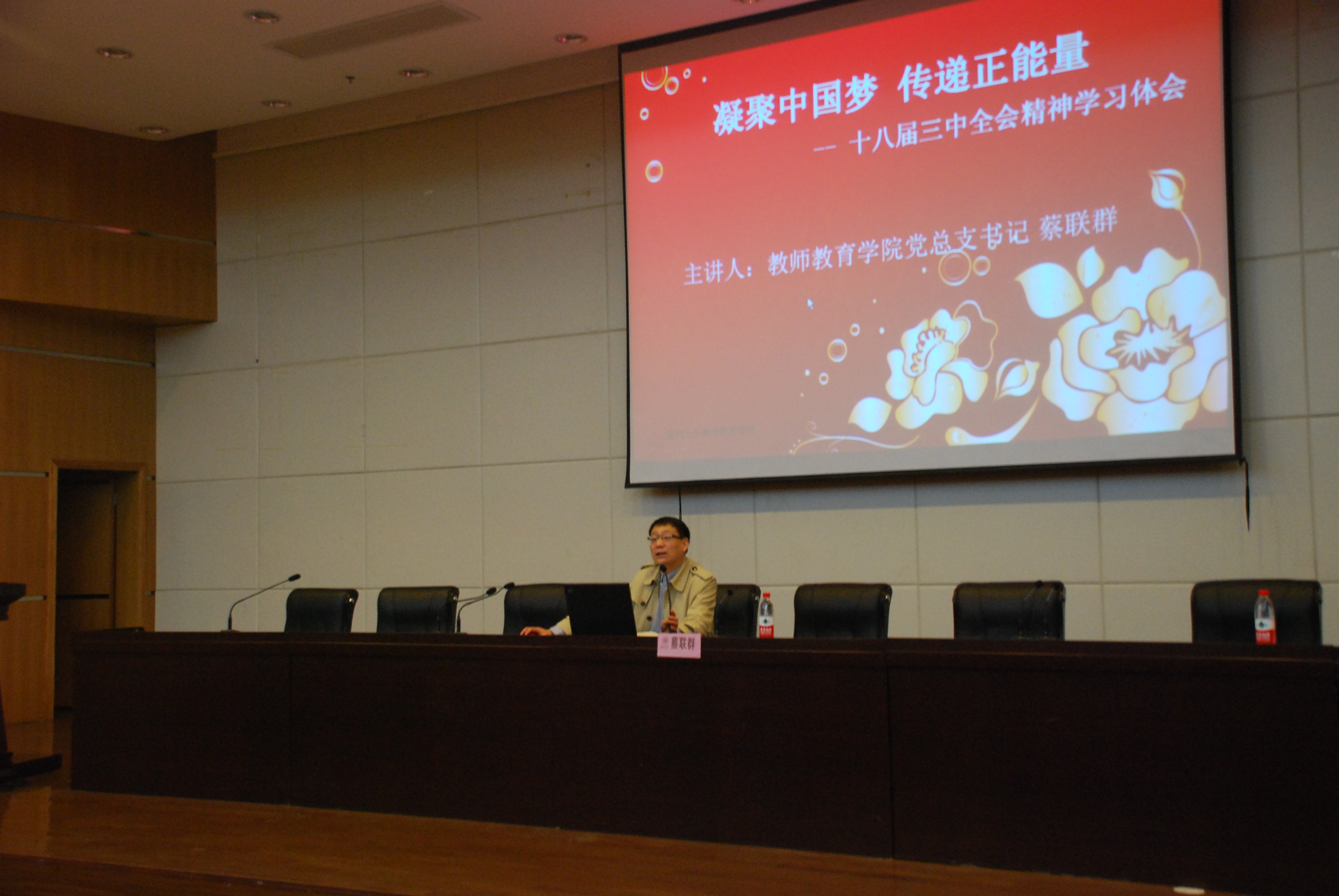 党总支书记蔡联群老师在南校图书馆育英大礼堂作了题为《凝聚中国梦,传递正能量——十八届三中全会精神学习体会》的精彩报告,辅导员严晓秋老师和全体骨干培训班学员近180人到场参加。