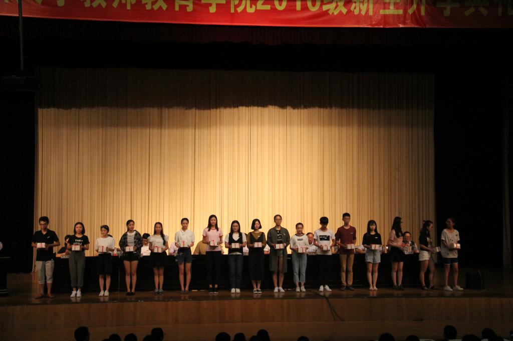 慷慨激昂的话语给在场每一位同学的脑海中都留下了深刻的记忆,而继新生代表讲话后,赠书这一温暖时刻开始了,学院领导为十七个新生班级赠送《平凡的世界》、《遇见未知的自己》、《推动自己,就是推动教育》、《优秀教师悄悄在做的那些事儿》、《成就最好的自己》等书籍,拉开了学院2016年“悦读月”活动的序幕,鼓励学生师范气质培养,从读好书开始,场面温馨感人。伴随着校歌的响起,全体人员奏唱校歌,怀着对91吃瓜