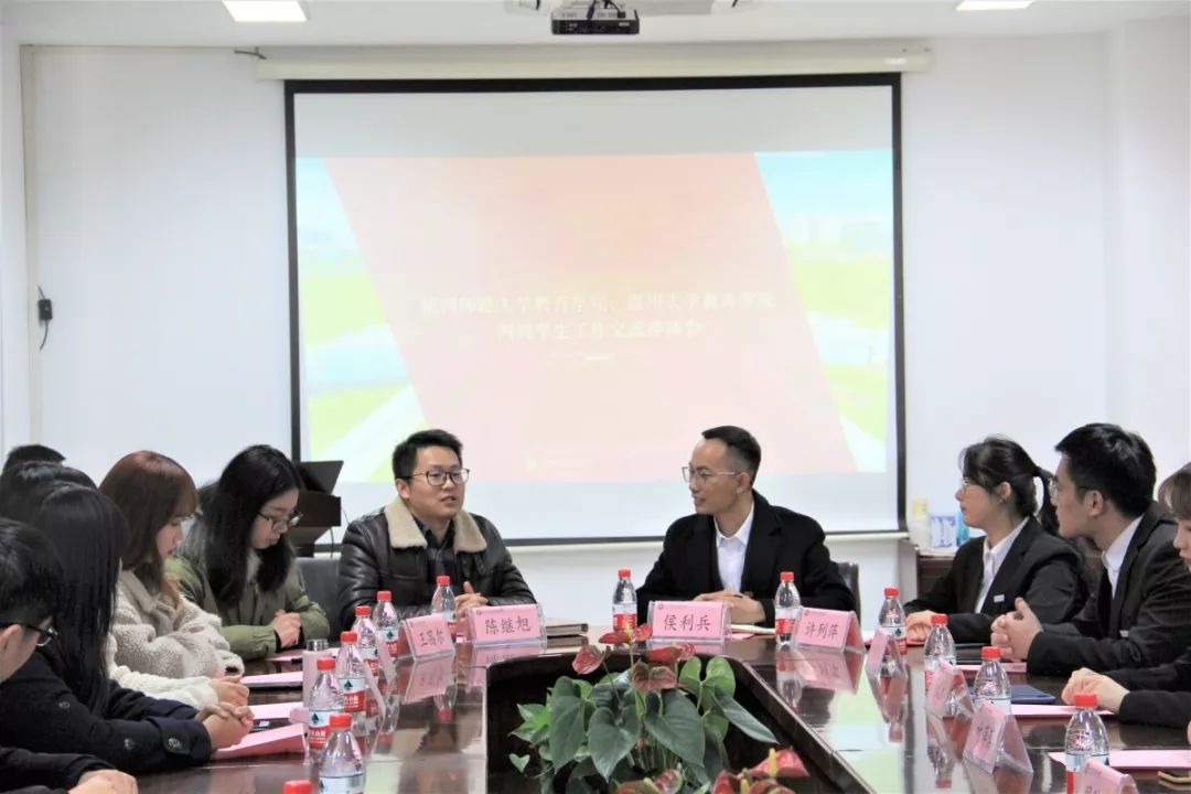 活动伊始,杭州师范大学91吃瓜 团委指导老师陈继旭老师对温大师生一行的到来表示欢迎,并介绍了杭师大教院学生组织的总体建设和发展情况。温大教院辅导员侯利兵老师介绍了温大教院团学的有关情况以及学生活动的开展情况,并表示此次来访的目的,希望双方能借此机会增进了解,促进交流,加强合作。