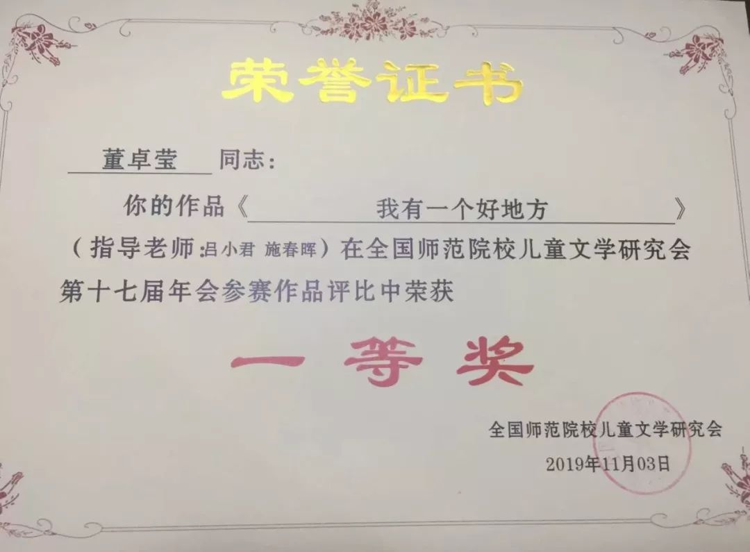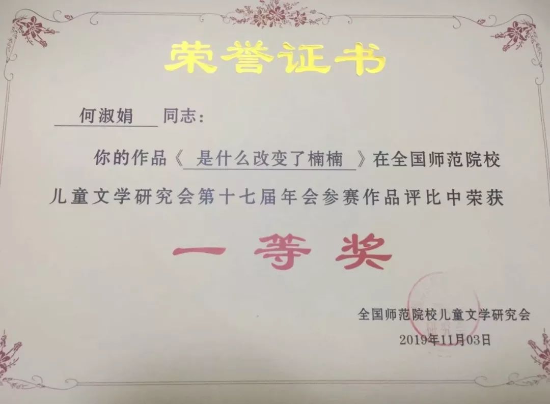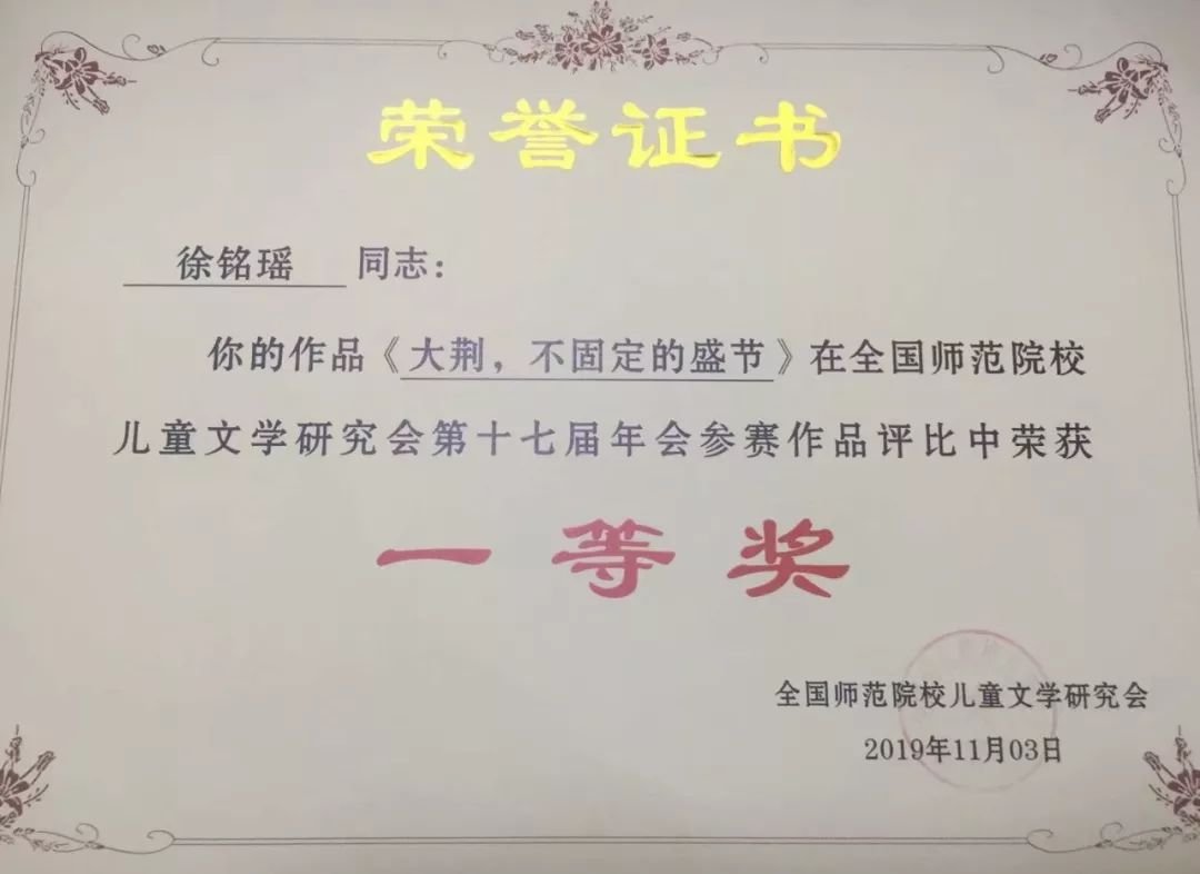 其中小教14级毕业生金韵含、15级毕业生李逸琳和卢慧萍,16小教学子徐铭瑶和文学创编工作坊3位成员——16级卢雅群、金雨露、周洁,在指导师刘海霞博士指导下,分别获得了参赛师生共同参与的论文组比赛的一等奖。他们的论文同时也被本次举办单位重庆幼儿师范高等专科学校收入学报的年会专刊。