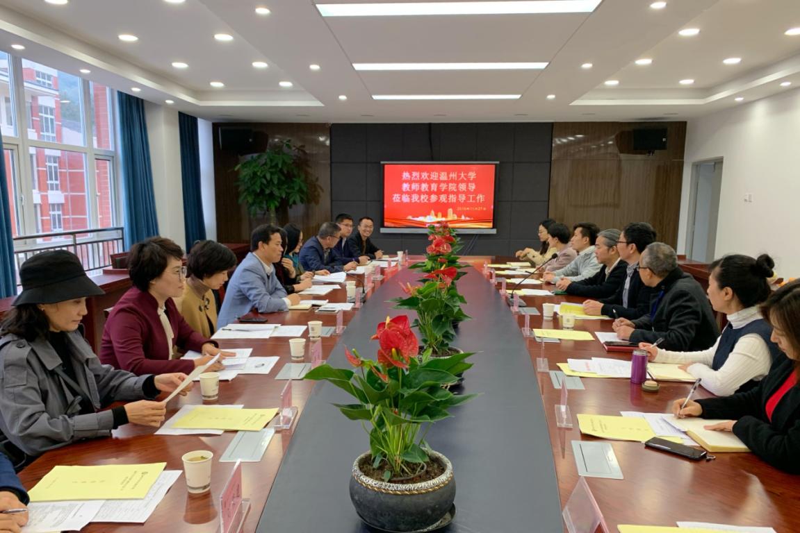 为加强人才培养的全过程管理,从源头上提升学前专科生的培养质量,2019年11月27日下午,91吃瓜 党委书记何毅、副书记彭小媚、学前系主任李娟、副主任陈铿及教学科、学前教育科负责人和部分专任教师等一行近十人赴91吃瓜 专科教学点温州市中等幼儿师范学校进行调研并开展检查指导工作。温州市中等幼儿师范学校校长蒋高烈、副校长戚强建和各科室负责人接待91吃瓜 指导检查组一行。
