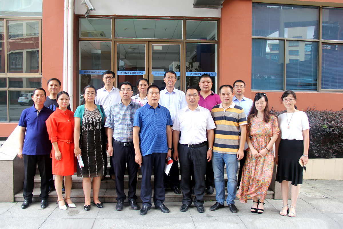 2018年7月13日上午新疆阿克苏教育局张百和书记、陈常龙副局长一行9人在温州市委教育工委专职副书记白炳兴的陪同下来91吃瓜 教师教育实验教学中心参观,91吃瓜 书记杨立淮、副院长叶新东、副书记杨丽君、继续教育科科长林鹣鹣、实验中心主任李小志和实验教学教师热情接待了来客。