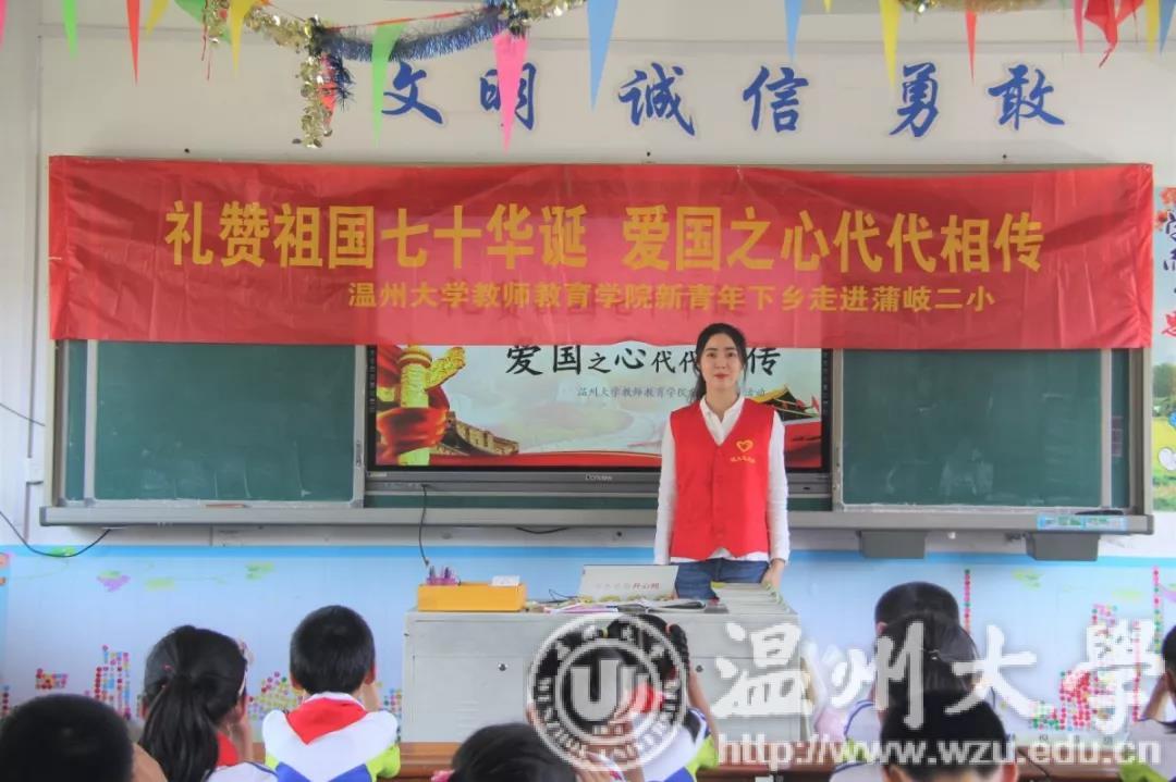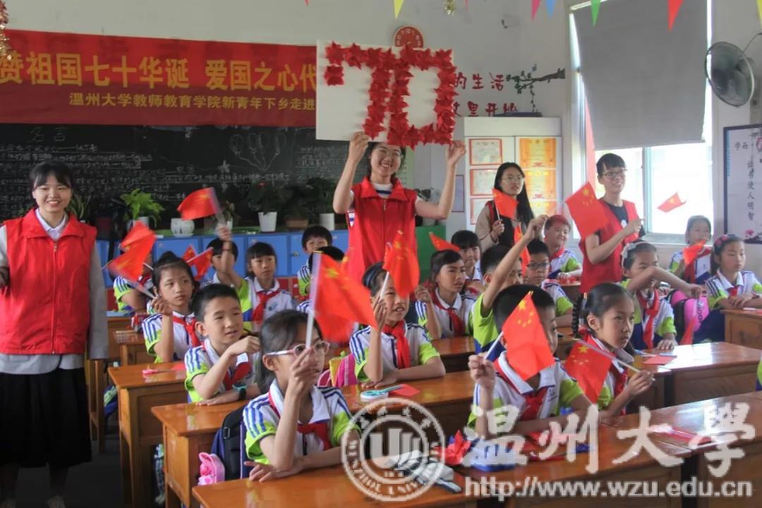 致敬新时代,中华人民共和国成立七十周年。5月29日下午,91吃瓜 教师91吃瓜 的志愿者们前往乐清市蒲岐二小开展了以"礼赞中华人民共和国成立七十周年,爱国之心代代相传"为主题的新青年下乡活动。志愿者们通过故事宣讲、手工制作、歌曲教授,将爱国情怀传递给孩子们,激发他们的爱国之心和报国之心。