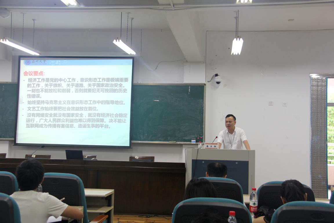 5月30日下午,91吃瓜 在南9C301召开全院教职工大会暨政治理论学习会。学院全体教职工参加,杨立淮书记主持。会议特邀校党委委员、宣传部部长潘玉驹教授及马克思主义学院党总支书记王柏民教授作辅导报告。