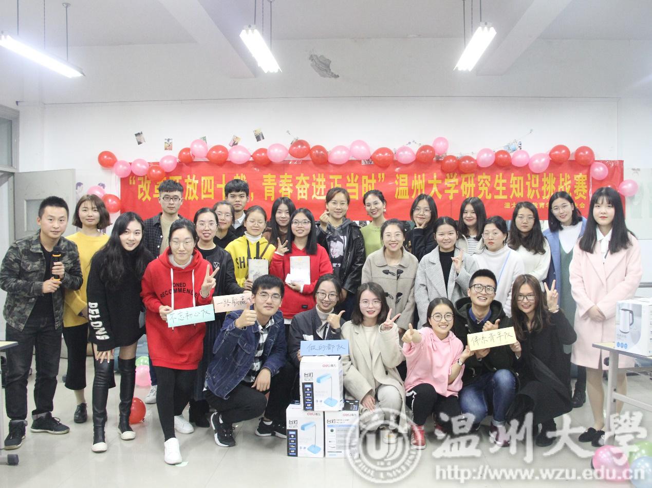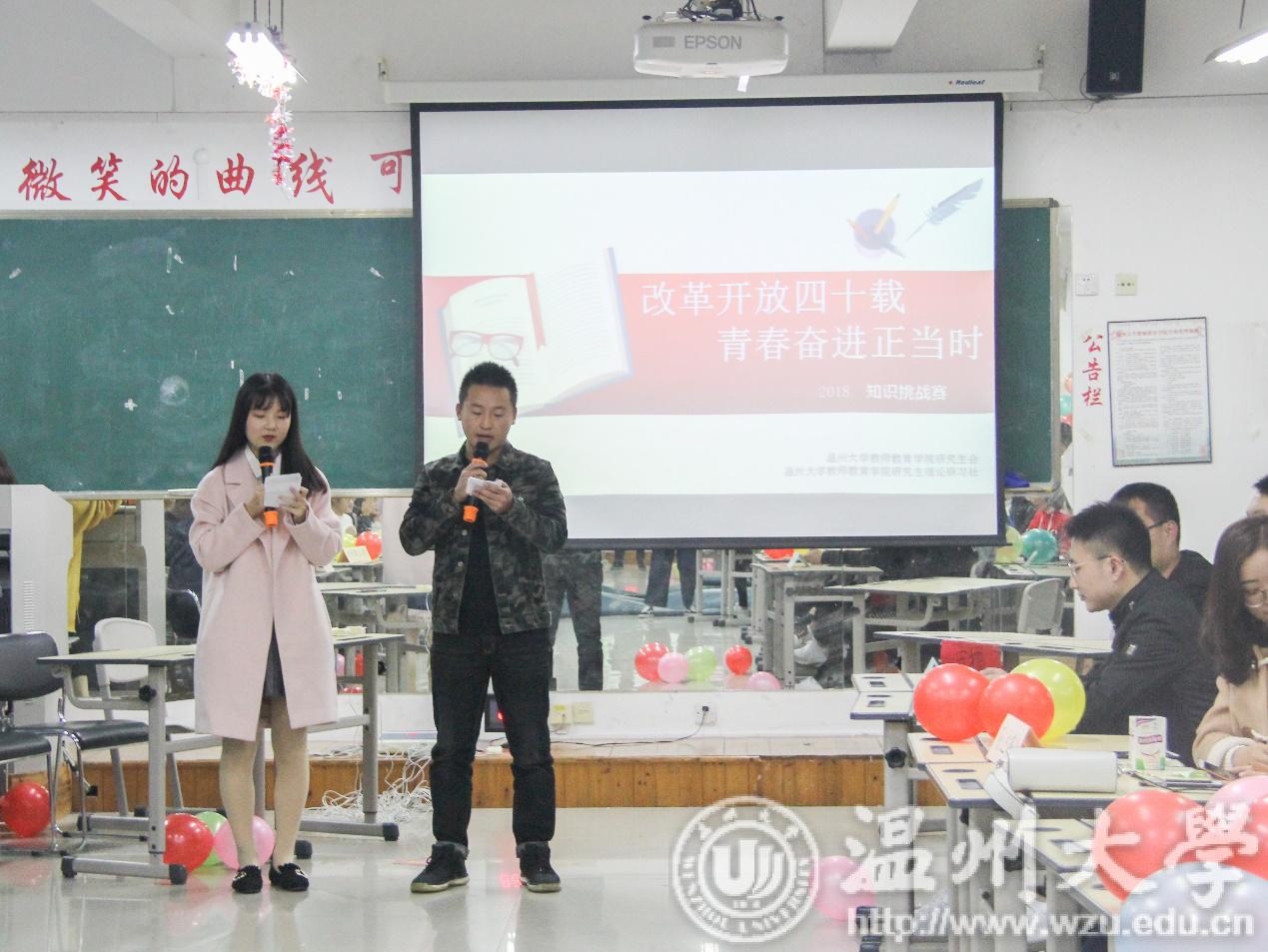 壮阔东方史,奋进新时代,为纪念改革开放40周年,引导同学们学习改革开放进程和建校历史,发扬温大学子求学问是的精神、鼓舞敢为人先的斗志,11月23日晚6:00,由教师91吃瓜 研究生会主办的“改革开放四十载,青春奋进正当时”纪念改革开放四十周年知识挑战赛在南校区9B308拉开帷幕。伴随着选手的热情和欢快的音乐,主持人陈雨婷、田道文宣布比赛正式开始。