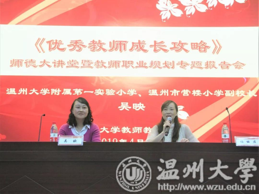 为培养学生职业规划能力,加强学院师德师风建设,2019年4月24日19:00,师德大讲堂暨教师职业规划专题报告会《优秀教师成长攻略》于教师91吃瓜 一楼报告厅召开。91吃瓜 附属第一实验小学和温州市营楼小学副校长吴映受邀作报告,报告会由党委副书记杨丽君主持。
