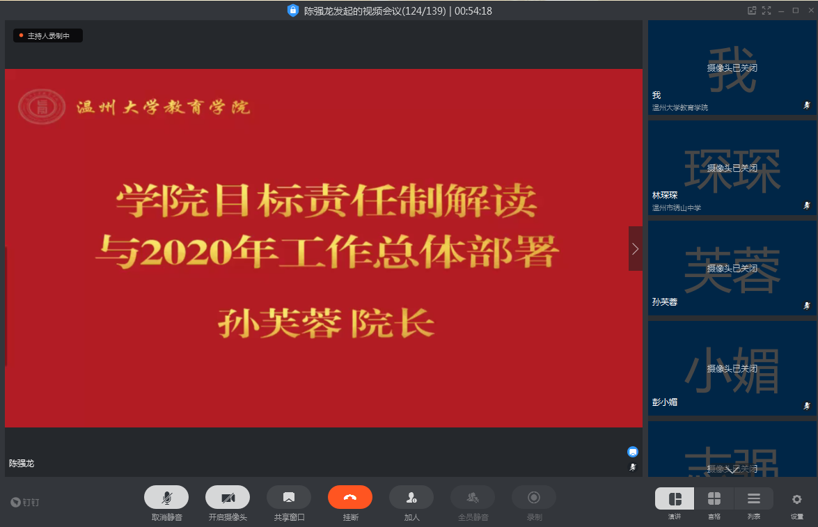 首先,叶新东、王志强、林琛琛、彭小媚等学院领导结合分管工作作通报部署。叶新东副院长就近期网络教学情况做了通报,并对学院教学常规、教学重点做了强调。林琛琛副院长就一个多月线上教学的工作亮点和学前专科后二工作的推进情况做了通报。根据调研数据,学院线上教学基本做到了线上线下实质等效,学院推出了精准培训、精彩课例、精妙学坊三大主推手助力线上教学,学院线上教学得到学生和学校教学督导的高度认可。此外,她根据学院制定的教育实践实施方案作了具体部署。王志强副院长传达学校研究生教育工作会议精神,并通报近期学院研究生教育工作和国家课题申报情况。彭小媚副书记就近期学院学生思政工作作通报部署。她强调要继续深抓两大紧急要事,努力培育三大学科竞赛,持续推进四大特色工作;学院继续做好全院学生的每日一报和“三返”学生的劝返工作;持续推动学风建设、班级管理、招生就业、心理健康、党团建、学科竞赛、宣传等各方面工作有序运转;宣传工作突出,学院 “云班会”成为学校典范。