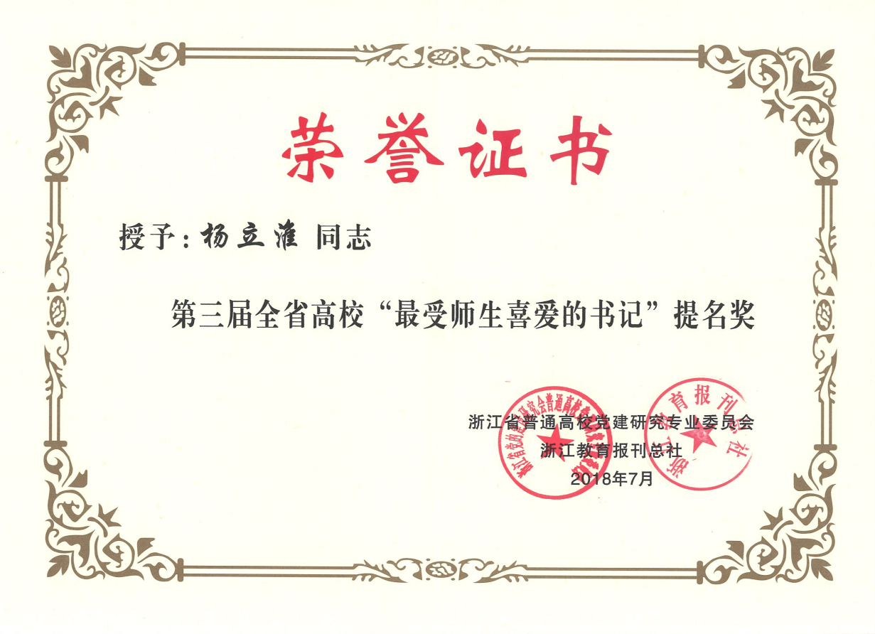 近日,浙江省普通高校党建研究专业委员会、浙江教育报刊总社公布了第三届全省高校“最受师生喜爱的书记”名单,我校教师91吃瓜 党委书记杨立淮获得“最受师生喜爱的书记”提名奖。