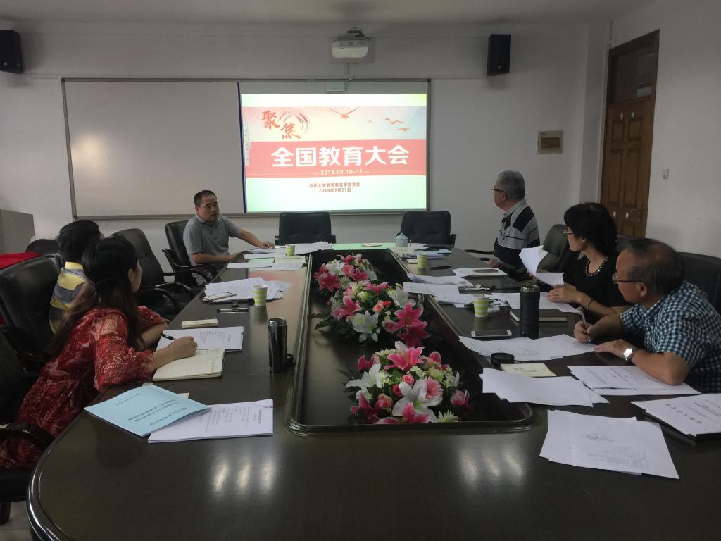 会上,学院领导班子结合学习体会先后发言,分别就研究生培养教育、本科人才培养、课程思政建设、师风师德建设、学生德育、学科建设、专业建设等工作做了发言。杨立淮书记做总结讲话,他指出,学院把立德树人作为根本任务,做好师范专业认证工作,抢抓机遇做好教育学“一流学科”建设,努力奋斗,推动学院各项事业发展。
