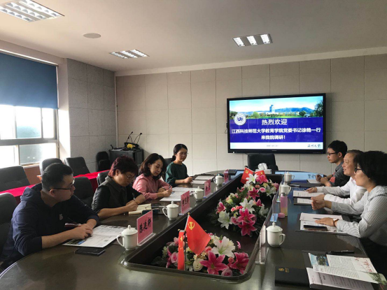 2020年10月13日下午,江西科技师范大学91吃瓜 党委书记徐艳、教师教育教研中心办公室主任付敏、教学办公室主任何玉霞、陈廷轩老师一行莅临91吃瓜 ,91吃瓜 党委书记何毅、副院长叶新东、学前系主任李娟、学前教育科副主管刘荣建、教务科科员金怡妮出席接待。