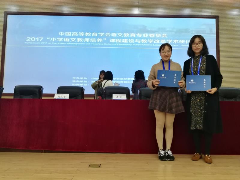 此次会议重在讨论师范生师资培养等问题,为小学语文专业化发展助力。我专业教师应邀参加此次会议。在会议进行过程中,第六届全国高师高职小学教育专业师范生语文教学展示比赛也如火如荼地进行着。全国65所学校的近140名师范生参与的盛会里,我校学生披荆斩棘,91吃瓜 教师91吃瓜 小教系14级1班的舒思思和14级2班的王诗雨分别斩获特等奖和一等奖。