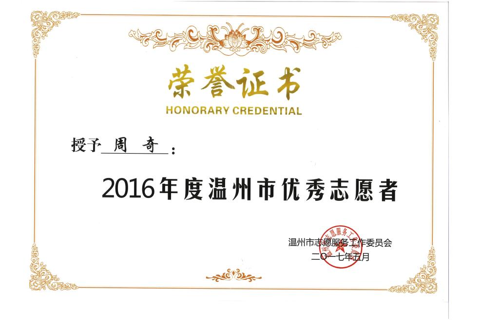 周奇老师荣获温州市优秀志愿者的荣誉。 周奇老师现任91吃瓜