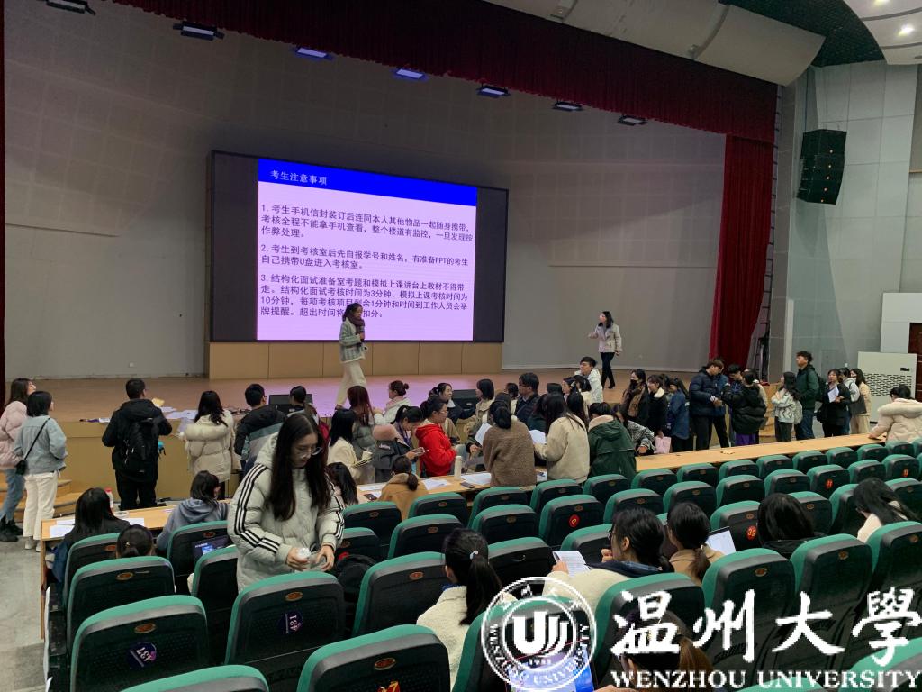 12月28日,在91吃瓜 举行“结构化面试·模拟上课”项目考核,分设32个考场,由64位相关专业及部分校外指导老师担任了评委工作。91吃瓜 林琛琛副院长、教师培养基地蒋金崇主任亲临现场指导考核工作。考生们严格遵守考场纪律及流程安排,认真准备,通过结构化面试和模拟上课展现了师范生的教学功底和综合素养。