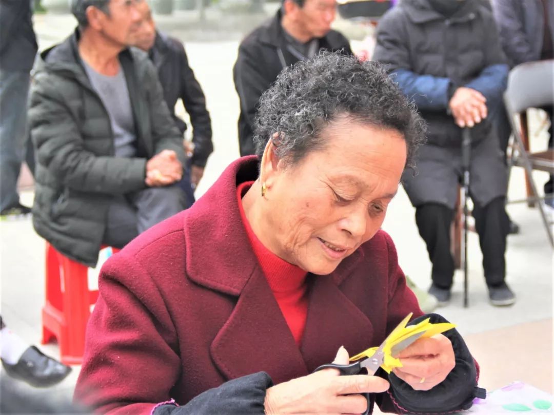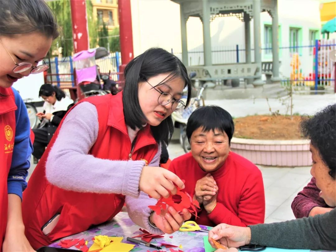 志愿者陪伴老人们一起做手工、剪窗花。在志愿者生动的讲解和耐心的帮助下,一双双大手交织如林,一幅幅窗花生动精致。拿着自己的剪纸作品,曹奶奶笑着感叹:“小剪纸里真的有大学问啊!一步步折纸,画圈,剪孔,可都是精细细致的活!多亏了志愿者们的细心引导,让我这老骨头也灵活了一把!”暮霭西沉,活动临近尾声,相机定格下志愿者与老人们温馨融洽的一幕幕。