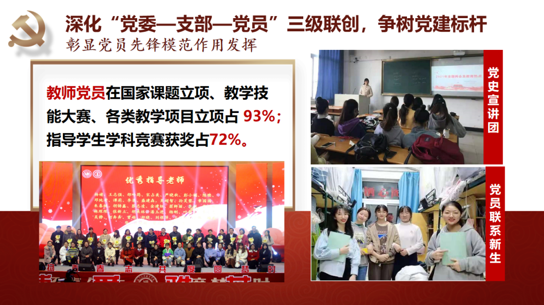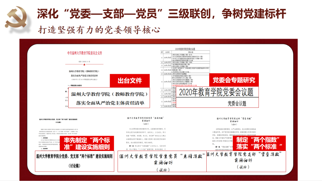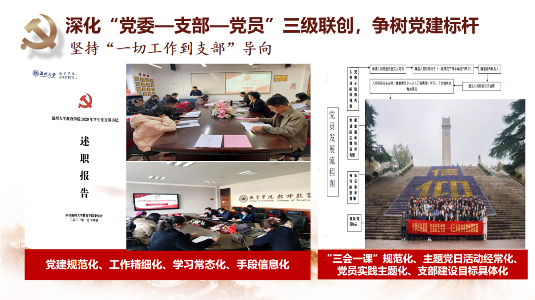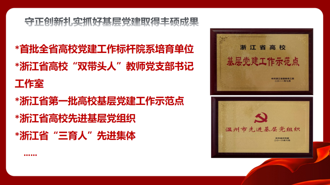学院党委坚持守正创新抓好基层党建基础。党委始终坚持深化“党委—支部—党员”三级联创,争树党建标杆。一是打造坚强有力的党委领导核心,落实“两个议事规则”,深化“四责协同”,制定“主体责任清单”,率先实践“两个指数”;二是坚持“一切工作到支部”导向,不断探索“党建规范化、工作精细化、学习常态化、手段信息化”的工作方法,夯实基层组织基础;三是不断彰显党员作用发挥,教师党员在课题申报、教学项目立项等中占比93%,指导学生科创竞赛获奖占比72%,作用发挥十分明显。近年来,学院师生30多人次获省高校优秀党务工作者、省优秀教师、省“三育人”先进个人、第三届省高校“最受师生喜爱的书记”提名奖、省“万名好党员”等省级个人荣誉,教师党员入选国家省市各类人才22人次。2019年,学院党委入选首批浙江省高校党建工作标杆院系培育创建单位。“知心姐姐”党支部获评教育部第二届全国高校“两学一做”支部风采展示活动工作案例(全国仅25项),教育学系党支部获首批“浙江省高校‘双带头人’教师党支部书记工作室”。