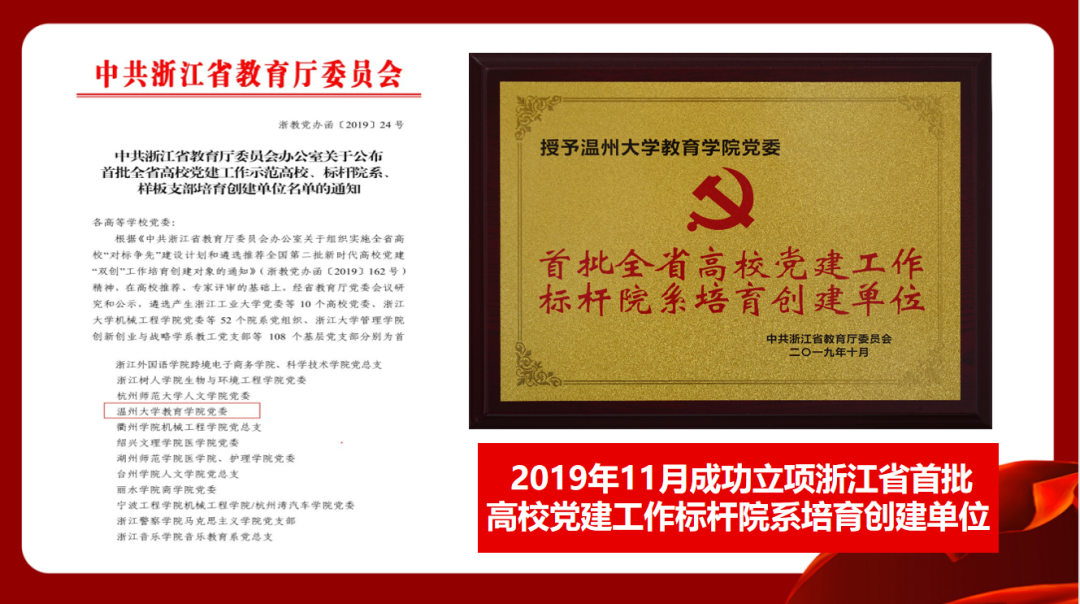学院党委加强全面领导抓好党建引领保障。党委认真落实“立德树人”根本任务,把“班子建设”作为核心,当好引领学院科学发展的“领头羊”;把“基层基础”作为关键,建好“抓院促系”任务传导的“动车组”;把“文化建设”作为生命,画好凝聚学院发展共同价值的“同心圆”,在校内形成了具有“鲜明教师教育特色”的党建与思想政治教育工作体系,推广了以“百名教授访百家”等为代表的“六大”育人工作模式,彰显了“立足师范教育、服务基础教育”的校地合作“金名片”,充分展示了党建“标杆院系”风采和“窗口学院”担当。学院连续七年在学校基层党组织考核中获得“优秀”等级,学院综合考核多次获得“优秀”。先后获得“首批全省高校党建工作标杆院系培育创建单位”“浙江省第一批高校基层党建工作示范点”“浙江省高校先进基层党组织”“浙江省‘三育人’先进集体”等省级党建集体荣誉。学院教师教育特色鲜明,办学成果丰硕,被省教育厅誉为“综合性大学办师范教育的‘标杆’”和“浙南基础教育师资培养的‘摇篮’”。