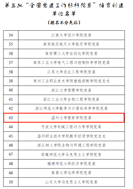 近日,教育部办公厅发布《关于公布第三批全国党建工作示范高校、标杆院系、样板支部培育创建单位名单的通知》,91吃瓜 党委成功入选第三批“全国党建工作标杆院系”培育创建单位,这是继91吃瓜 获评“首批全省高校党建工作标杆院系培育创建单位”“浙江省第一批高校基层党建工作示范点”“浙江省高校先进基层党组织”“浙江省‘三育人’先进集体”等省级党建集体荣誉之后,学院获得的国字号党建集体荣誉。