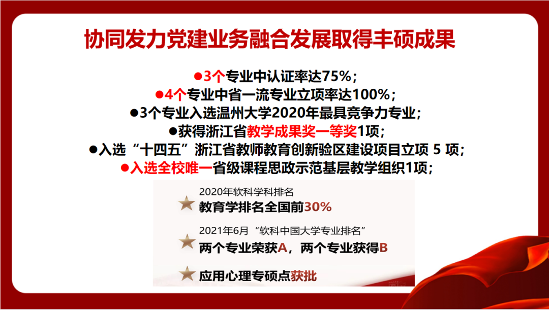 学院党委坚持协同发力抓好党建业务融合。学院始终突出三个主体建设。一是坚持党委主导,突出党委落实立德树人的政治主体。注重师德师风建设,把好教师“引进政审”“入职教育”“日常教育”等主要环节;守住意识形态阵地,严把课堂讲授、教材选用、学术活动等重要关口;开展院系治理体系改革,实行制度“废改立”,完善非常设机构职能,构建清廉教院体系。二是坚持教师为本,突出教师学科专业建设的责任主体。强化学术氛围营造,每年举办数十场学术讲座,举办系列高水平学术会议,鼓励教师开展学术交流;重视发展平台建设,制定“惠生惠师”计划,开展教师成长帮扶;注重教师权利保障,修订绩效分配办法和教学业绩考核办法等制度,落实双代会提案,建设院系治理共同体。三是坚持学生中心,突出学生实现成长发展的利益主体。推行“考研帮二十条”“考编帮十条”,学生各类大赛取得瞩目成果,打造学习教院;推进专科教育向前三教学点延伸、实施本科生四年生涯规划和研究生学术能力提升等工作,打造成长教院。近三年,学院引进博士教授45人,新增国家“万人计划”青年拔尖人才、浙江省“万人计划”教学名师等一批高层次人才。获得国家级和省部级科研项目30余项,获得教育部高等学校科学研究优秀成果奖、全国教育科学研究优秀成果奖、浙江省哲学社会科学优秀成果奖、浙江省教学成果奖等一批标志性奖项。学生在各类学科比赛竞赛中获国家级奖项27项,全国学会级奖项279项,省级奖项88余项,师范生考编率达到80%以上,求学深造的同学80%以上被“双一流”高校及海外名校录取。学院省级以上一流专业立项率达100%、学院师范专业认证通过率、省级及以上一流课程立项率、省级课程思政立项率和省部级课题立项数、教科研成果获奖数、学生学科竞赛数等均居全校前列。