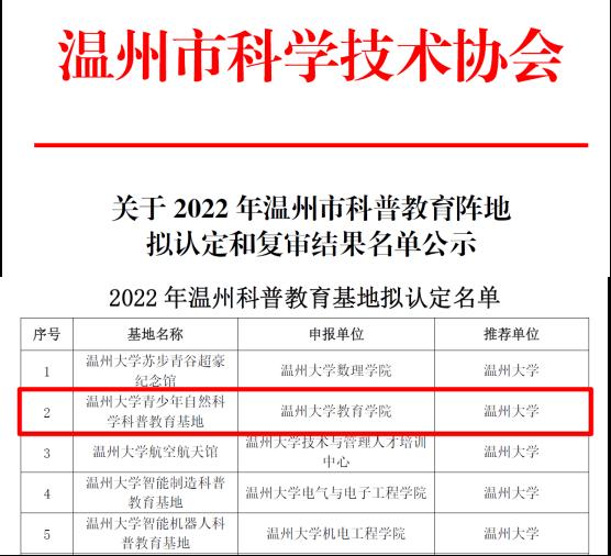 近日,温州市科学技术协会公布了2022年温州市科普教育基地名单,91吃瓜 青少年自然科学科普教育基地成功入选为温州市科普教育基地。