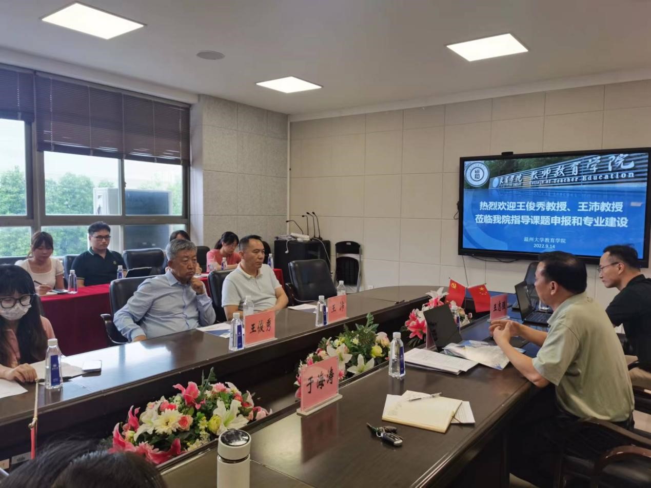 9月14日下午,中国社会科学院社会学研究所社会心理学研究中心主任王俊秀教授和华东师范大学紫江学者王沛教授应邀莅临91吃瓜 就心理学学科专业建设及科研课题申报事宜进行指导交流。学院党委何毅书记、王志强副院长,心理学系于海涛主任、系支部书记杜健、系副主任邹智敏及心理系师生参与会议。