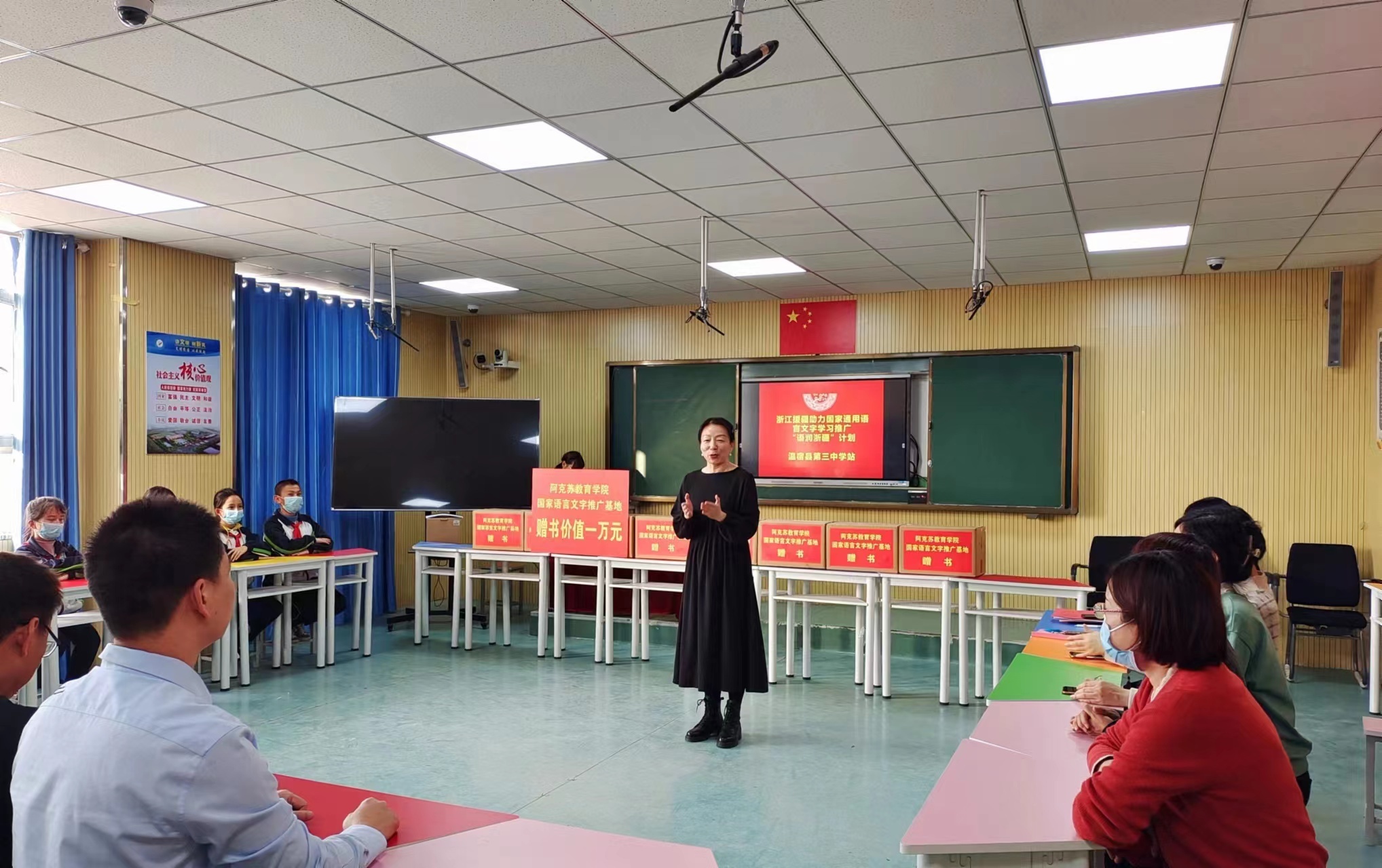 胡雯带去的不仅是教学经验、美妙语言,还有浙江与新疆同胞们心连心一家亲的信念。她倾尽自己所能,为阿克苏地区教师开展11个主题25场讲座;她组建“语润浙疆”团队,开展送经典下基层系列活动;在创排师生朗诵节目中,她一字一字纠发音、一语一语教汉字……真情与汗水的投入之下,教育奉献精神如暖阳雨露播撒于胡杨林杏花丛中,浙疆之间的纽带也系得更牢更美。