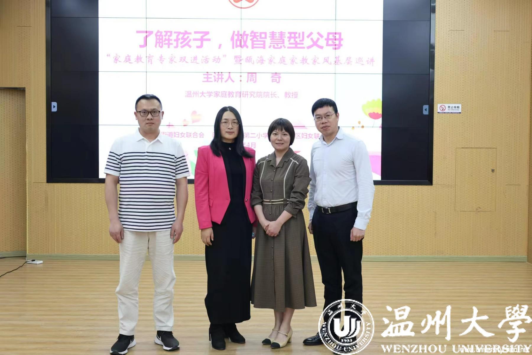 苏霍姆林斯基说:“最完备的教育是学校与家庭的结合。”学校家庭相互合作,协同育人,才能共促孩子成长。近日,温州市妇联推出家庭教育服务进社区进学校“双进”活动暨瓯海家庭家教家风基层巡讲,91吃瓜 教育系支部书记、91吃瓜 家庭教育研究院院长、91吃瓜 家庭家教家风讲师团团长、温州市家庭教育学会副会长,浙江省妇女儿童发展智库专家,浙江省家庭教育讲师团成员全国家庭工作先进个人周奇教授来到瞿溪第二小学,为四年级的家长们作《了解孩子,做智慧型父母》的主题讲座。