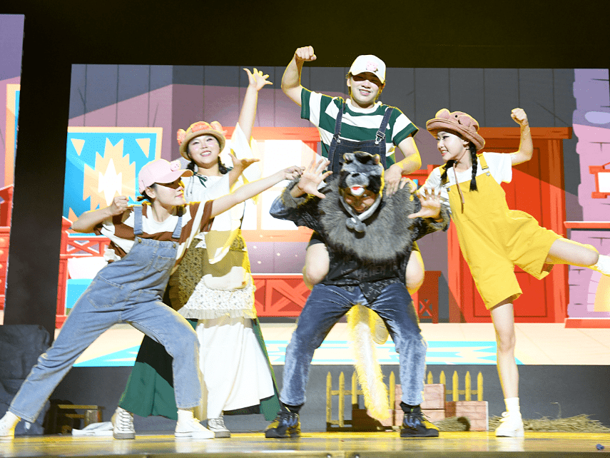 《三只小猪》主要讲述了三只小猪面对大灰狼的挑战的故事。童欣儿童剧团的演员们用丰富的表情与灵活的肢体动作,生动演绎了三只性格各异的小猪建造“稻草屋”“木头屋”和“砖头屋”的剧情。最终,只有踏实且有规划的老三在面对大灰狼的袭击时成功抵御风险,且帮助了两位哥哥。孩子们沉浸在跌宕起伏的故事情节中,体会到勤劳踏实、做好规划的人生智慧。
