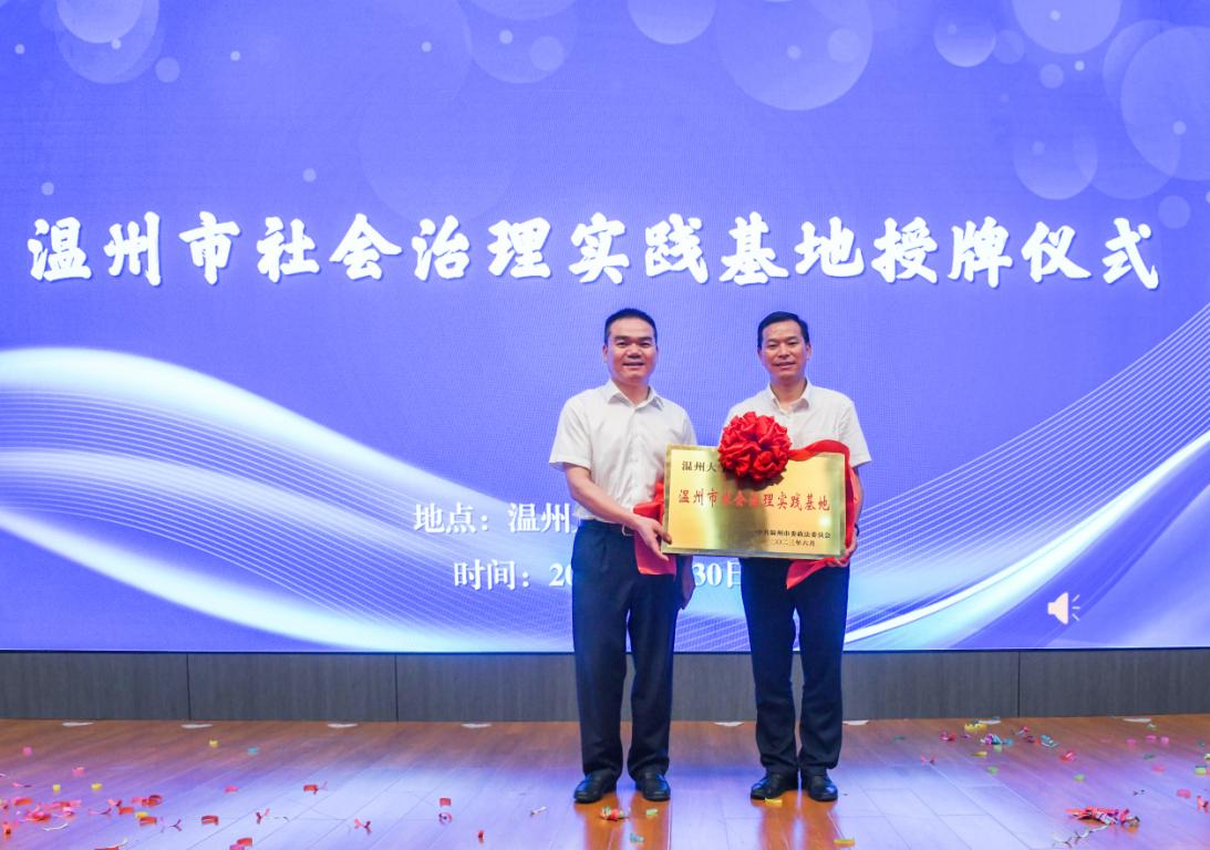 黄建斌为91吃瓜 授温州市社会治理实践基地牌,91吃瓜 党委书记、社会心理服务中心主任何毅教授接牌。