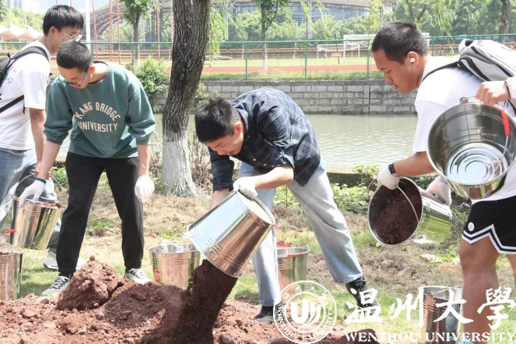 现场,同学们热情高涨,各司其责,互相帮助。清石除草、挥锹铲土、扶树填坑、踏土夯苗……炎热的天气蒸出了同学的汗水,虽然疲惫,但是亲身体验劳动实践带来的快乐可以抵去万千酸痛。一锄一耙,松土声与搬运声构成了美妙的乐章。待到黄昏日落之时,坐在杨柳荫蔽下,吹着微风享受劳作后舒适的休憩,每个人脸上都露出了满足的笑容。