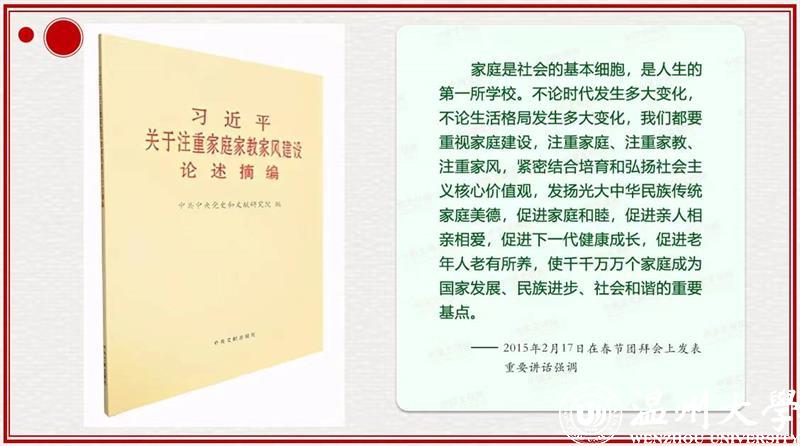 2021年7月,中宣部、中央文明办、中央纪委机关、中组部、国家监委、教育部、全国妇联印发《关于进一步加强家庭家教家风建设的实施意见》中强调:要以习近平新时代中国特色社会主义思想为指导,以建设文明家庭、实施科学家教、传承优良家风为重点,强化党员和领导干部家风建设,突出少年儿童品德教育关键,推动家庭家教家风建设高质量发展。随着《家庭教育促进法》的实施,家庭教育从“家事”上升到“国事”,父母们开启“依法带娃”的时代。家长是孩子的第一任老师,家庭教育不仅影响着孩子的人生走向,也关系到家庭甚至社会的和谐稳定。家风是家庭核心价值观和行为准则的集中体现,家风是所处时代社会价值的缩影,与所处时代的社会背景和发展要求紧密相连。