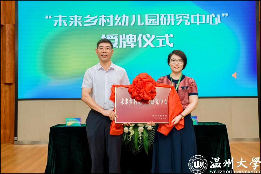 市学前教育指导中心主任陈苗和温大91吃瓜 党委书记何毅分别代表市学前教育指导中心和温大91吃瓜 进行“未来乡村幼儿园”合作研究签约。温州市教育局在温大91吃瓜 设立“未来乡村幼儿园研究中心”并向院方代表授牌。