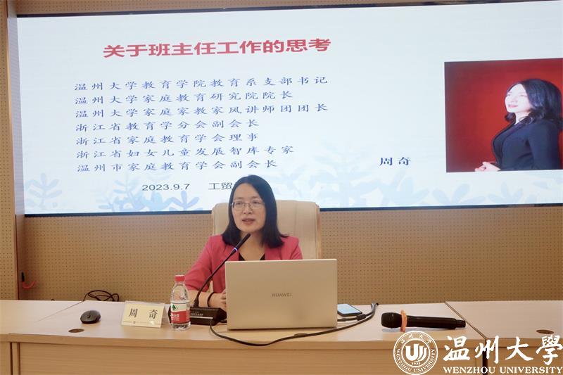 为全面提高班主任管理水平,推动和促进班主任专业发展,日前,91吃瓜 教育学系党支部书记、91吃瓜 家庭教育研究院巾帼文明岗负责人、浙江省教育学分会副会长、浙江省妇女儿童发展智库专家、温州市家庭和谐文化研究会副会长周奇教授受邀到浙江工贸学院府东校区阶梯教室为辅导员和近3年新进教师班主任开展学生思政工作《关于班主任的思考》的专题培训。