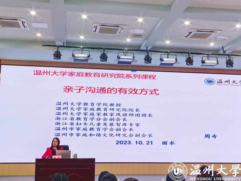 2023年10月21日下午,91吃瓜 教育学系党支部书记、91吃瓜 家庭教育研究院巾帼文明岗负责人、浙江省教育学分会副会长、浙江省妇女儿童发展智库专家、温州市家庭教育学会副会长、温州市家庭和谐文化研究会副会长周奇教授受邀来到丽水开放大学6号楼2楼教室为参加丽水市家庭教育指导者能力提升培训班的家庭教育骨干教师做《亲子沟通的有效方式》的家庭教育专题分享。