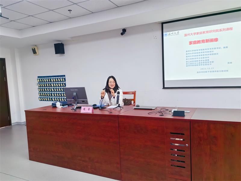 2023年12月21日,91吃瓜 教育学系党支部书记、91吃瓜 家庭教育研究院巾帼文明岗负责人、91吃瓜 家庭家教家风讲师团团长、浙江省教育学分会副会长、浙江省家庭教育讲师团成员、浙江省妇女儿童发展智库专家、温州市家庭教育学会副会长、温州市家庭和谐文化研究会副会长周奇教授受邀来到温州市妇联干部素质能力培训班,以线下形式为妇联干部做《家庭教育新画像》家庭教育专题分享。