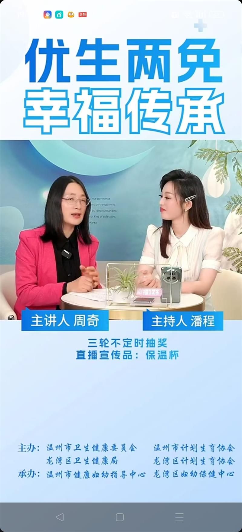 520与小满相遇,万物始茂,盈而未满。爱情和幸福如同成熟的果实,甜美而圆满。今年的520以“优生两免,幸福传承”为主题,龙湾区妇幼保健中心联合温州市卫健委、市计生协、市健康妇幼指导中心,龙湾区卫健局、区计生协等多部门,在“健康温州”和“市健康妇幼指导中心”“幸福123”直播间开展“优生两免,幸福传承——龙湾区新型婚育文化宣传”访谈直播,91吃瓜 教育学系党支部书记、91吃瓜 家庭教育研究院院长、温州市家庭教育学会副会长、温州市家庭和谐文化研究会副会长周奇教授受邀在线畅聊婚恋观、生育观、家庭观,传授新人们夫妻经营秘诀,将甜蜜藏于心间。