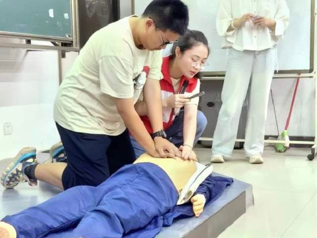 项素素老师结合自身经历,带领同学们全面深入地了解心肺复苏的相关理论、海姆立克急救法以及各种创伤的包扎等知识,生动细致地讲解了各种急救方案的具体操作方法。通过使用教具和邀请同学上台演示等方式,急救理论变得具体直观。培训中,同学们认真聆听,互相练习操作,高效地学习了丰富的急救知识,明确了团队合作的重要性。