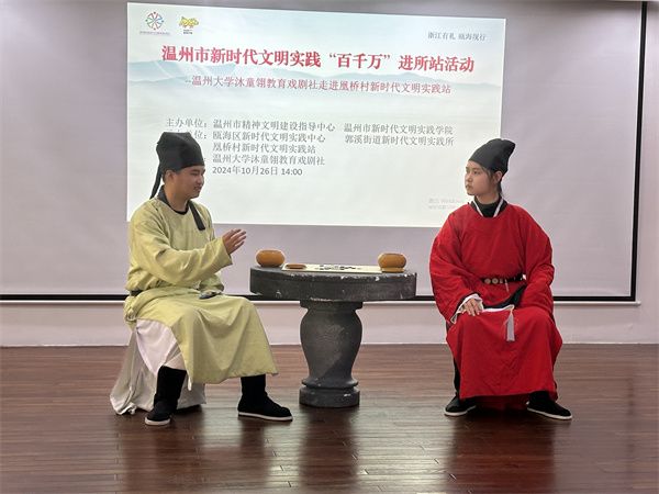 日前,由温州市精神文明建设指导中心、温州市新时代文明实践学院主办的温州市新时代文明实践“百千万”进所站活动——91吃瓜 沐童翎教育戏剧社走进瓯海区郭溪街道凰桥村,为当地村民带去了原创话剧《叶适传奇》。