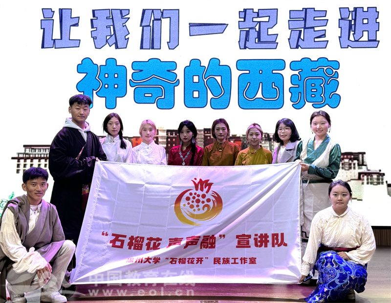 甜茶、青稞饼、糌粑和酥油茶齐登场,让小朋友们两眼放光;伴随着悠扬的藏族音乐,身着民族服装的同学们跳起“锅庄”,热闹非凡;一字一句,小朋友们用稚嫩的声音学藏语......近日,在瓯海第四幼儿园,91吃瓜 “石榴花开”民族工作室联合91吃瓜 学前教育系共建的“石榴花·声声融”宣讲队,为小朋友们带来了一场以“民族文化进校园 石榴花开绽初心”为主题的民族文化展演,以精彩的视听盛宴浸润孩童成长。