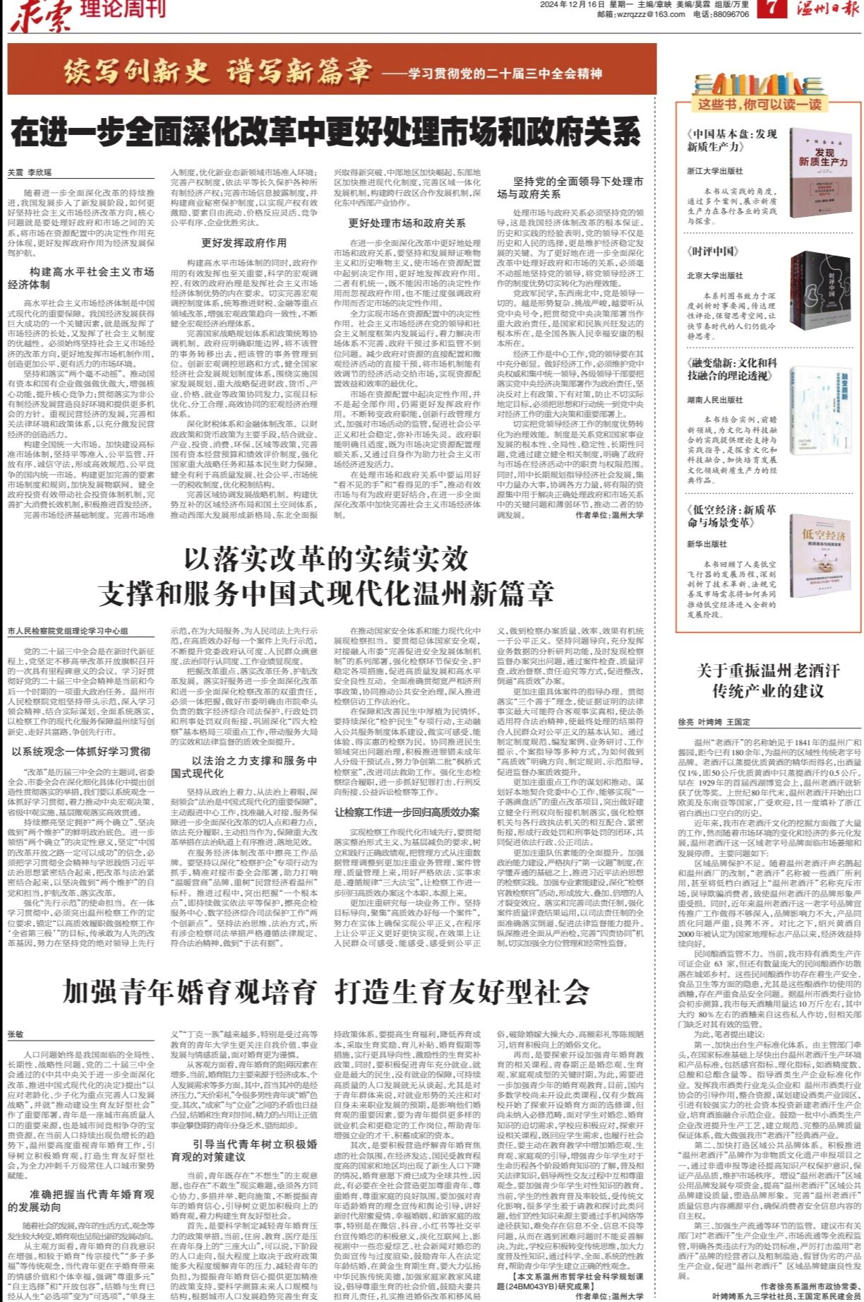 人口问题始终是我国面临的全局性、长期性、战略性问题。党的二十届三中全会通过的《中共中央关于进一步全面深化改革、推进中国式现代化的决定》提出“以应对老龄化、少子化为重点完善人口发展战略”,并就“推动建设生育友好型社会”作了重要部署。青年是一座城市高质量人口的重要来源,也是城市间竞相争夺的宝贵资源。在当前人口持续出现负增长的趋势下,温州要高度重视青年婚育工作,引导树立积极婚育观,打造生育友好型社会,为全力冲刺千万级常住人口城市聚势赋能。