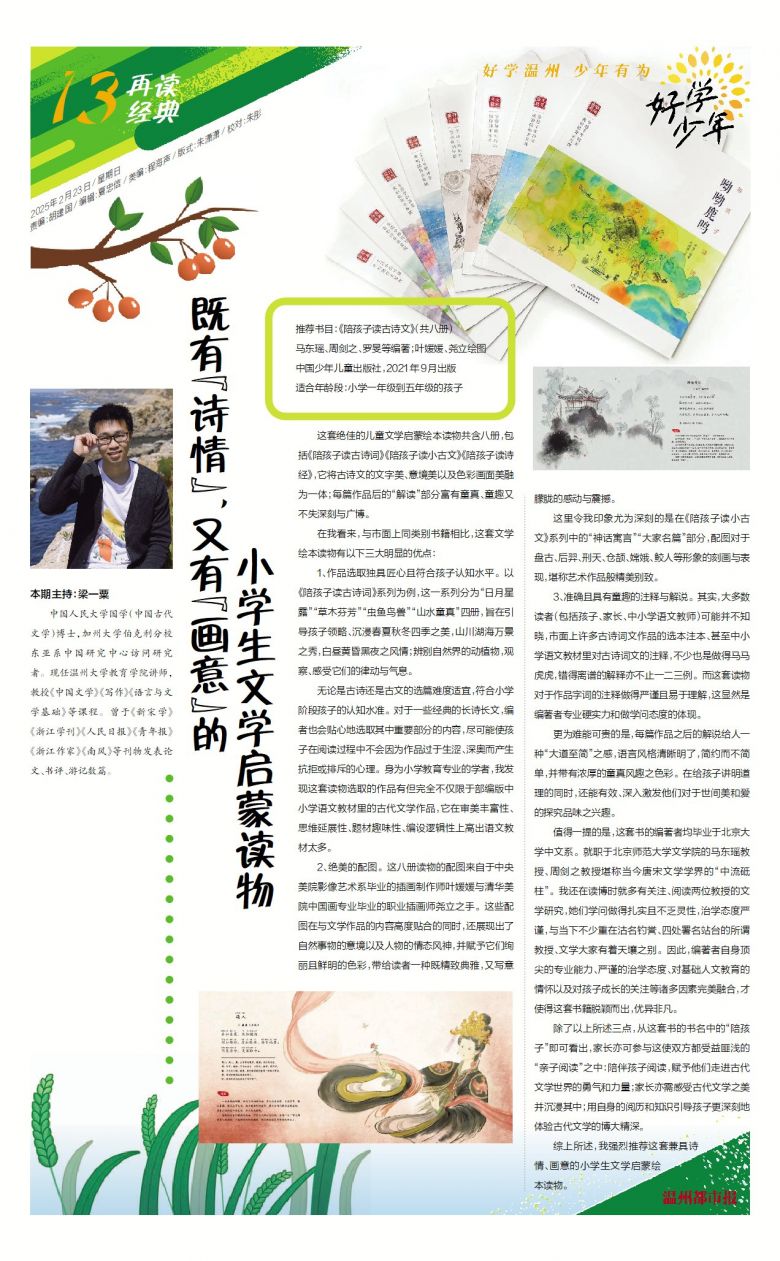 无论是古诗还是古文的选篇难度适宜,符合小学阶段孩子的认知水准。对于一些经典的长诗长文,编者也会贴心地选取其中重要部分的内容,尽可能使孩子在阅读过程中不会因为作品过于生涩、深奥而产生抗拒或排斥的心理。身为小学教育专业的学者,我发现这套读物选取的作品有但完全不仅限于部编版中小学语文教材里的古代文学作品,它在审美丰富性、思维延展性、题材趣味性、编设逻辑性上高出语文教材太多。