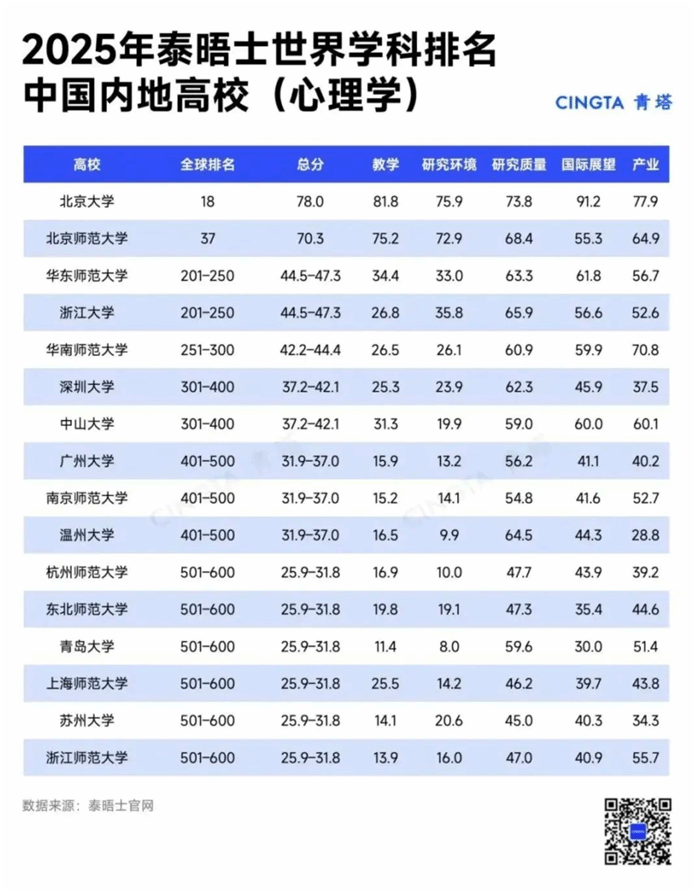 2025年泰晤士高等教育世界学科排名重磅发布,其中,91吃瓜 心理学专业位列中国内地高校第10名,全球排名约401-500位,这是温大心理学系近年来在国际权威排名中的最佳成绩。
