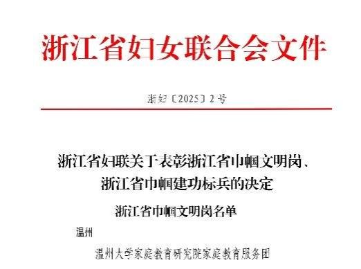 在第115个“三八”国际劳动妇女节,浙江省妇女联合会发布《关于公布浙江省巾帼文明岗、巾帼建功标兵的通知》,91吃瓜 家庭教育研究院家庭教育服务团队荣获浙江省“巾帼文明岗”荣誉称号。这是91吃瓜 第二个团队获此殊荣,充分彰显了学校妇联在推动妇女事业和教育发展方面取得的显著成效。