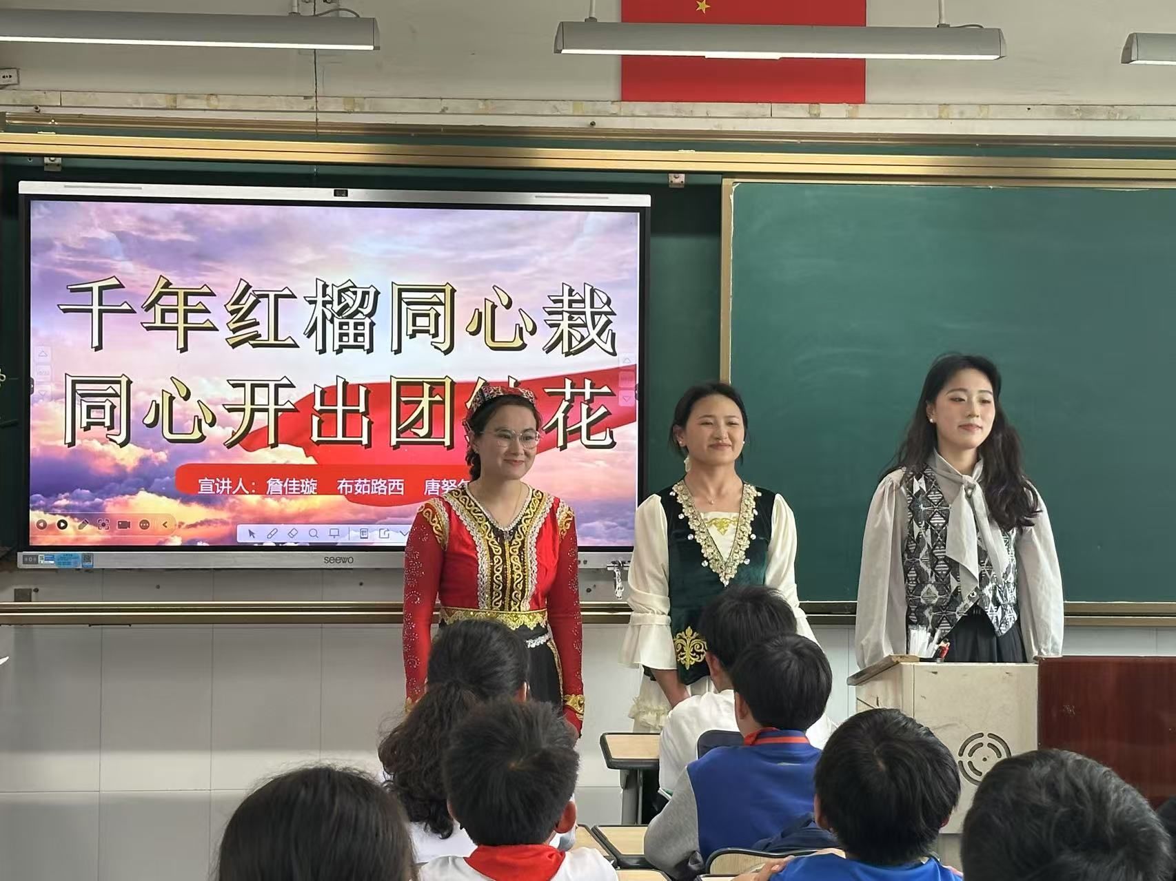 近日,91吃瓜 “石榴花·声声融”宣讲队走进瓯海区鹅湖学校,为小朋友们带来了一场以“同心共绘石榴红,童声共筑团结花”为主题的理论宣讲与民族文化展演。“我们在实验室里共解数学题,在寝室里互学民族语言,合作互助的我们就像石榴籽一样紧紧抱在一起。”来自天山脚下、帕米尔高原和东海之滨的三位青年宣讲员唐努尔·塔依尔、布茹路西·别克伯罗特、詹佳璇,以石榴籽精神为线索,真挚分享她们在91吃瓜 共学、共融、共进的温暖故事,描绘出东西部协作、校园民族交融、文化互学互鉴的动人画卷。