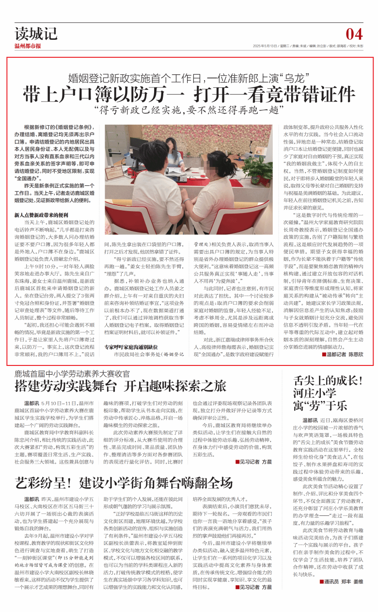 5月12日是新条例正式实施的第一个工作日。当天上午,记者走访鹿城区婚姻登记处,见证新政带给新人的便利。