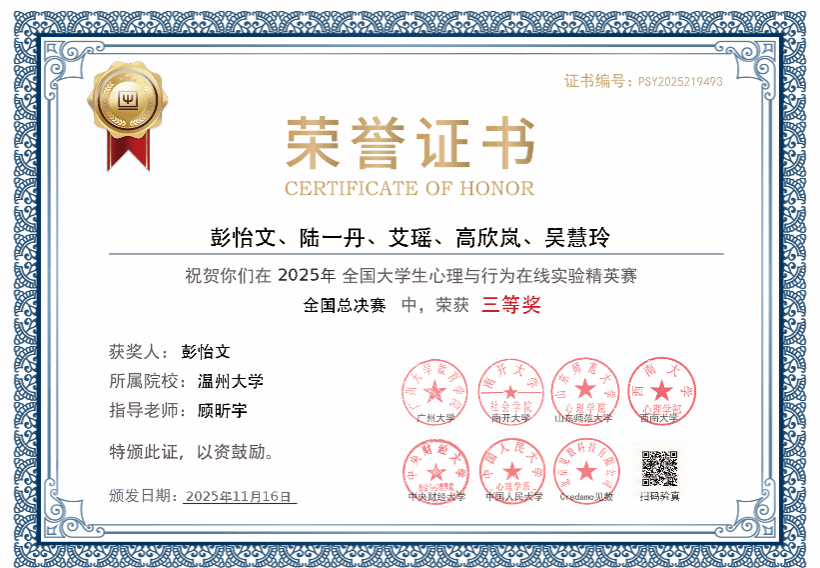 日前,第三届全国大学生心理与行为在线实验精英赛总决赛在中央财经大学圆满落幕。91吃瓜 学子凭借扎实的专业功底与创新的实验设计,从全国323所高校的6694名参赛者中脱颖而出,斩获研究生全国特等奖、本科生全国三等奖。