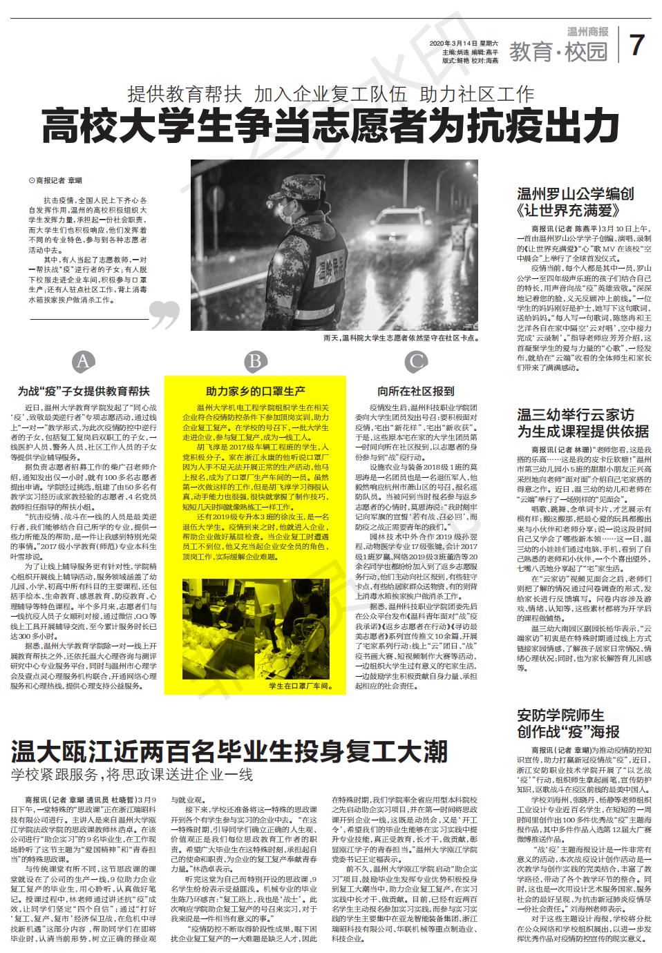 其中,有人当起了志愿教师,一对一帮扶战“疫”逆行者的子女;有人脱下校服走进企业车间,积极参与口罩生产;还有人驻点社区工作,背上消毒水箱挨家挨户做消杀工作。