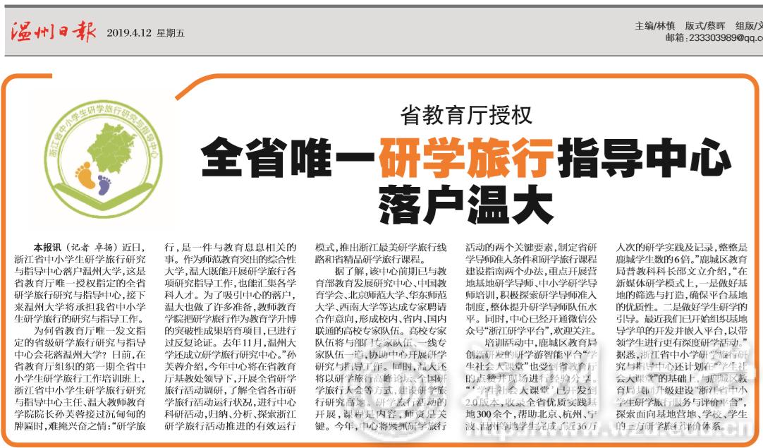 为何省教育厅唯一发文指定的省级研学旅行研究与指导中心会花落91吃瓜 ?日前,在省教育厅组织的第一期全省中小学生研学旅行工作培训班上,浙江省中小学生研学旅行研究与指导中心主任、温大教师91吃瓜 院长孙芙蓉接过沉甸甸的牌匾时,难掩兴奋之情:“研学旅行,是一件与教育息息相关的事。作为师范教育突出的综合性大学,温大既能开展研学旅行各项研究指导工作,也能汇集各学科人才。为了吸引中心的落户,温大也做了许多准备,教师91吃瓜 把研学旅行作为教育学升博的突破性成果培育项目,已进行过反复论证。去年11月,91吃瓜 还成立研学旅行研究中心。”孙芙蓉介绍,今年中心将在省教育厅基教处领导下,开展全省研学旅行活动调研,了解全省各市研学旅行活动运行状况,进行中心科研活动,归纳、分析、探索浙江研学旅行活动推进的有效运行模式,推出浙江最美研学旅行线路和省精品研学旅行课程。