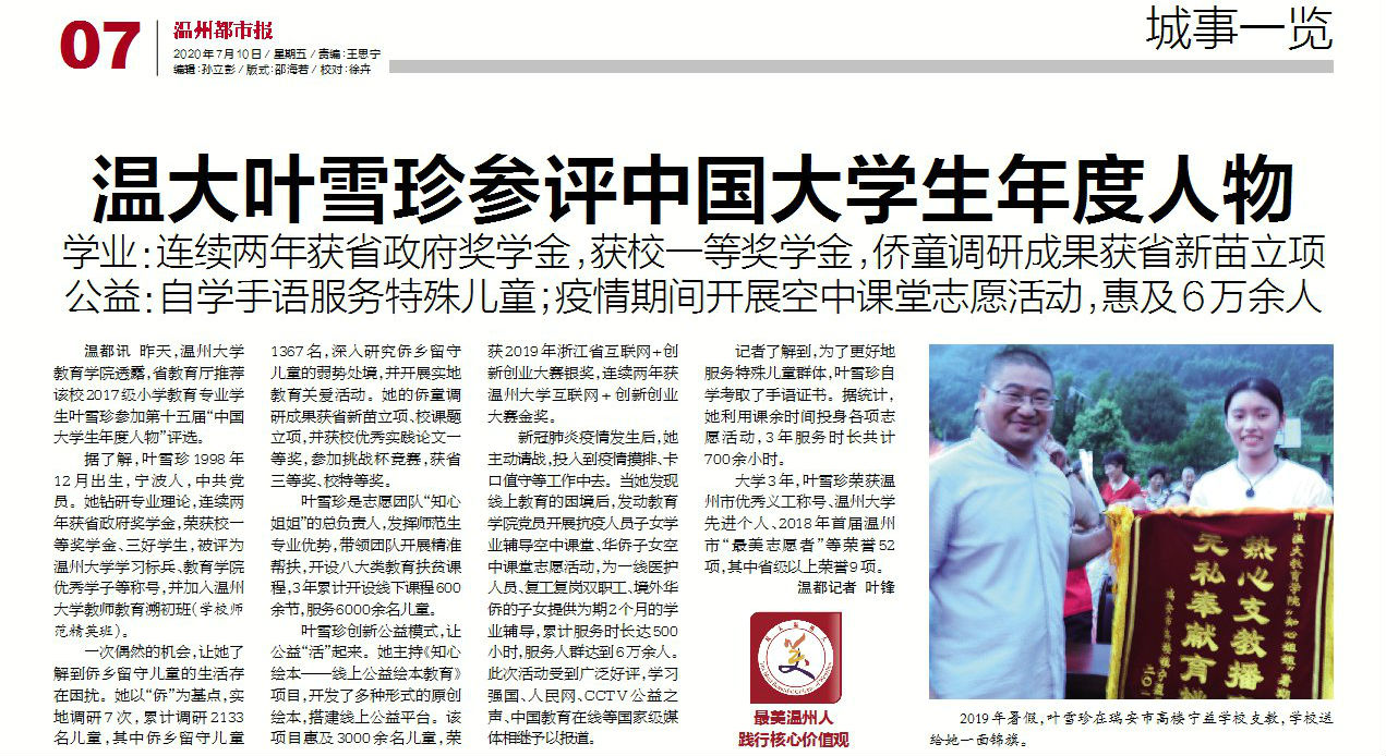 “坚守、向阳、担当,争做新时代青年追梦人”这是91吃瓜 2017级小学教育专业学生叶雪珍的座右铭,也是她的真实写照。7月9日,温大91吃瓜 透露,省教育厅推荐叶雪珍参评第十五届“中国大学生年度人物”评选。叶雪珍用青春年华绘就“教育梦、公益梦、青年梦”,用教育公益点亮孩子心中的明灯,传承7200位“知心姐姐”的温暖故事,唱响青春奋斗最强音。