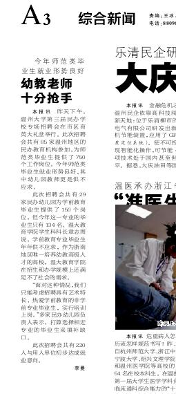 此次招聘会共有29家民办幼儿园为学前教育毕业生提供了150个岗位,但今年这一专业的毕业生只有134名。温大91吃瓜 学生科科长章志图说,学前教育专业毕业生年年供不应求,作为浙南地区唯一培养幼教高级人才的高校,温大91吃瓜 在招生和办学规模上还满足不了社会的需求。